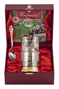 Набор для чая "45 лет"(3 пр.)- дерев.футляр, хруст.стакан,штамп,латунь,гравировка,ложка-нерж.грав.,DVD-открытка "Ты родился!" 1970 г.