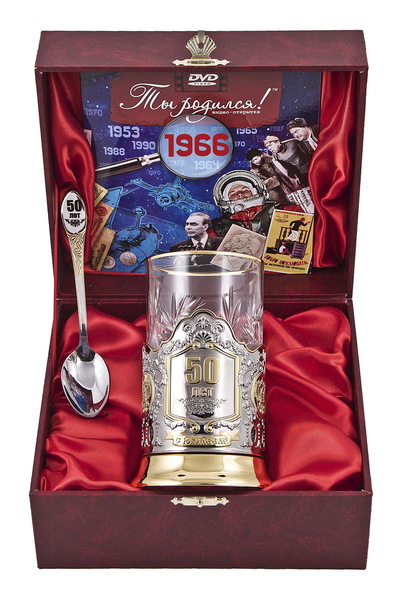 Набор для чая "50 лет" в золоте (3 пр.) дерев. футляр, хруст. стакан, штамп, ложка нерж.зол.грав.,Видеооткрытка