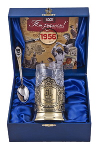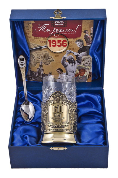 Набор для чая "60 лет"(3 пр.)- дерев.футляр, хруст.стакан,латунь,штамп,ложка-нерж.грав.,открытка"Ты-родился!" 1960 г.