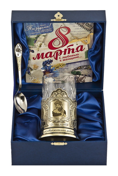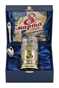 Набор для чая «8 марта» (3 пр.) - дерев. футляр, хруст.стакан, латунь, штамп, ложка - нерж. грав., открытка «8 марта»